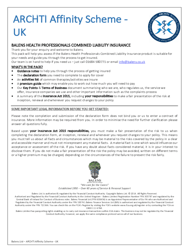 ARCH TI Affinity Scheme UK BALES HEALTH PROFESSIONALS COMBINED LIABILITY INSURANCEThank you for your inquiry and welcome to Bales. This pack will help you assess if the Bales Health Professionals