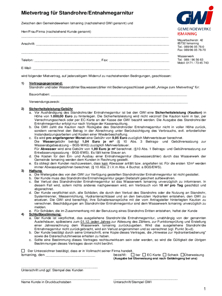 Mietvertrag for Standrohre/Entnahmegarnitur