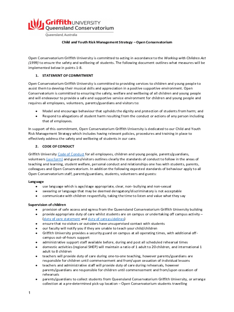Child and Youth Risk Management Strategy Open ConservatoriumOpen Conservatories Griffith University is committed to acting in accordance to the Working with Children Act (1999) to ensure the safety