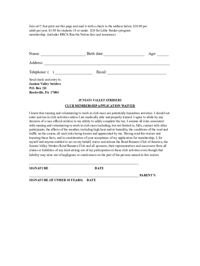 Join us!!! Just print out this page and mail it with a check to the address below. $10.00 per adult per year. $5.00 for students 18 or under. $20 for Little Striders program membership. (includes