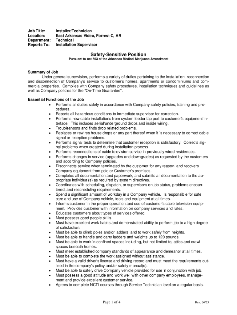 Job Title: Location: Department: Reports To:Installer/Technician East Arkansas Video, Forrest C, AR Technical Installation SupervisorSafetySensitive Position Pursuant to Act 593 of the Arkansas Medical
