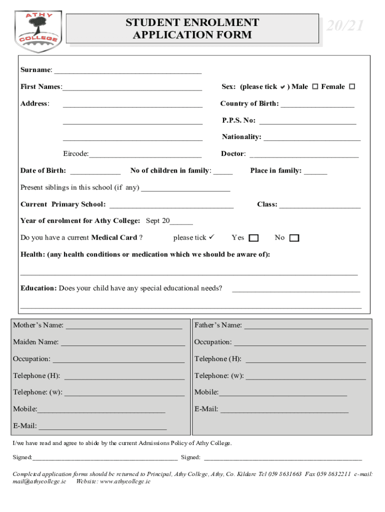 STUDENT Enrollment APPLICATION FORM20/21Surname: ___ First Names:___Sex: (please tick) Male Female Address:___Country of Birth: ______P. P.S. No: ______Nationality: ___Encode:___Doctor: ___Date of