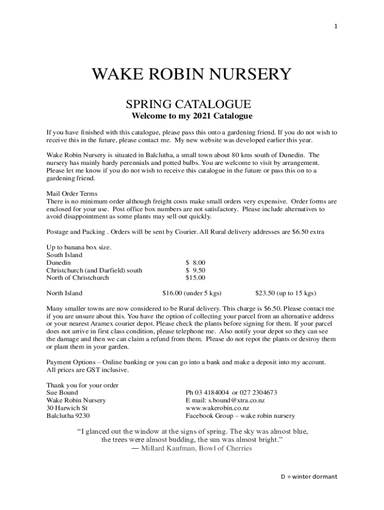 1WAKE ROBIN NURSERY SPRING Catalog Welcome to my 2021 Catalog If you have finished with this catalog, please pass this onto a gardening friend. If you do not wish to receive this in the future, please