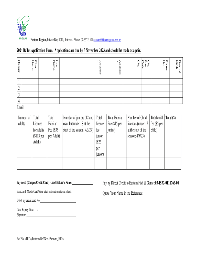 Eastern Region, Private Bag 3010, Rotor. Phone: 073575501 eastern@fishandgame.org.nz2024 Ballot Application Form. Applications are due by 3 November 2023 and should be made as a pair. Date of Birthstone