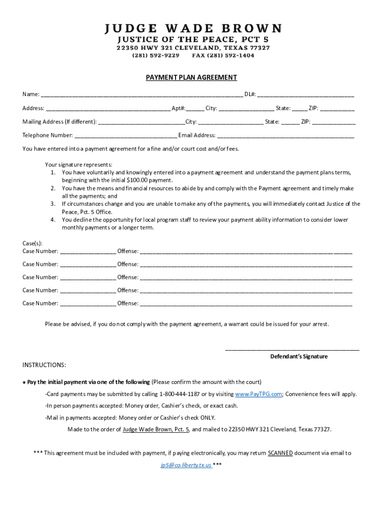 PAYMENT PLAN AGREEMENT Name: ___ DL#: ___ Address: ___ Apt#:___ City: ___ State: ___ ZIP: ___ Mailing Address (If different): ___City: ___ State: ___ ZIP: ___ Telephone Number: ___ Email Address: