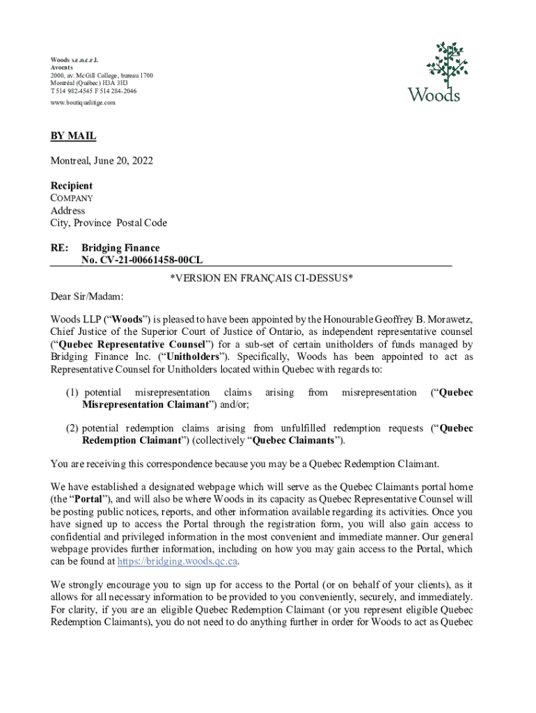 Get the free Bridging Finance No. CV-21-00661458-00CL *VER - Woods