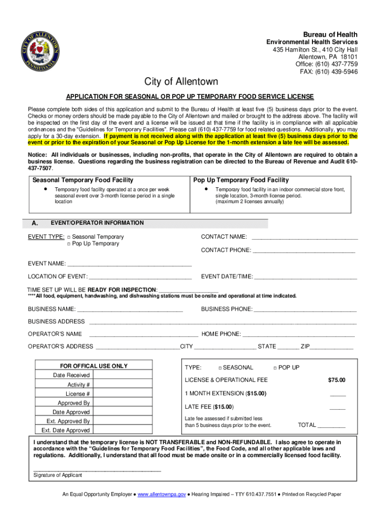 Bureau of Health Environmental Health Services 435 Hamilton St., 410 City Hall Allentown, PA 18101 Office: (610) 4377759 FAX: (610) 4395946City of Allentown APPLICATION FOR SEASONAL OR POP UP TEMPORARY