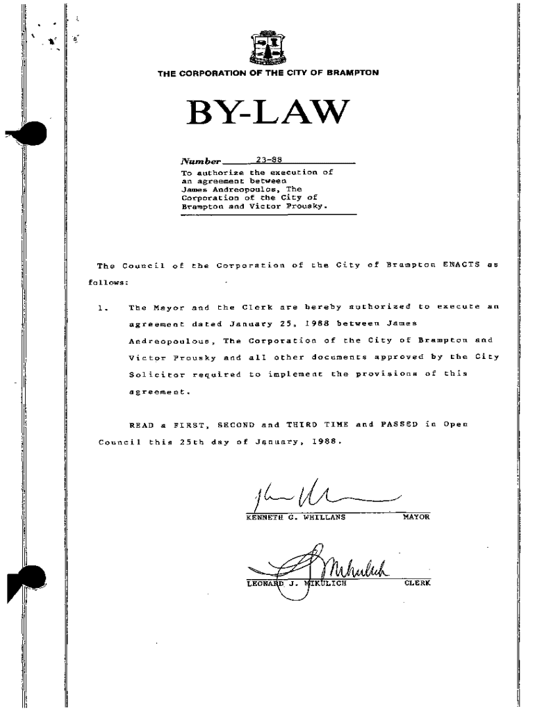 THE CORPORATION OF THE CITY OF BRAMPTONBYLAW Number ___2388___ To authorize the execution of an agreement between James Andreopoulos, The Corporation of the City of Brampton and Victor Proudly. The