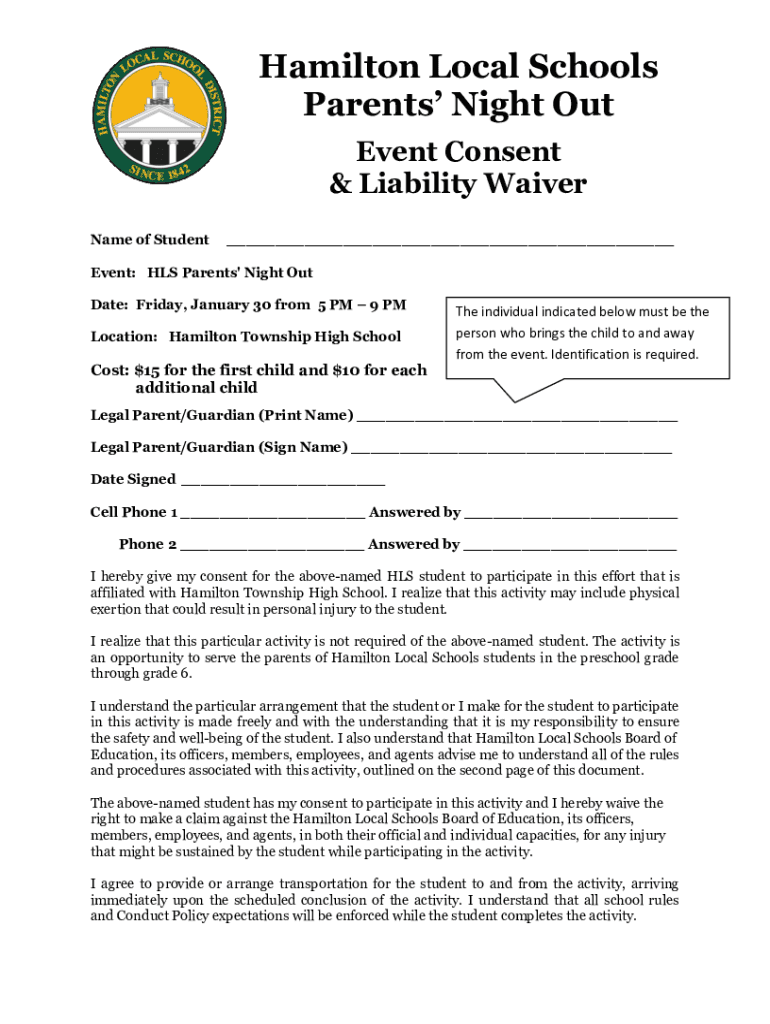 Hamilton Local Schools Parents Night Out Event Consent & Liability Waiver Name of Student___Event: HLS Parents\' Night Out Date: Friday, January 30 from 5 PM 9 PM Location: Hamilton Township High