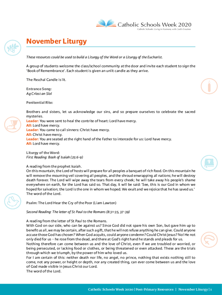 November Liturgy These resources could be used to build a Liturgy of the Word or a Liturgy of the Eucharist. A group of students welcomes the class/school community at the door and invite each student