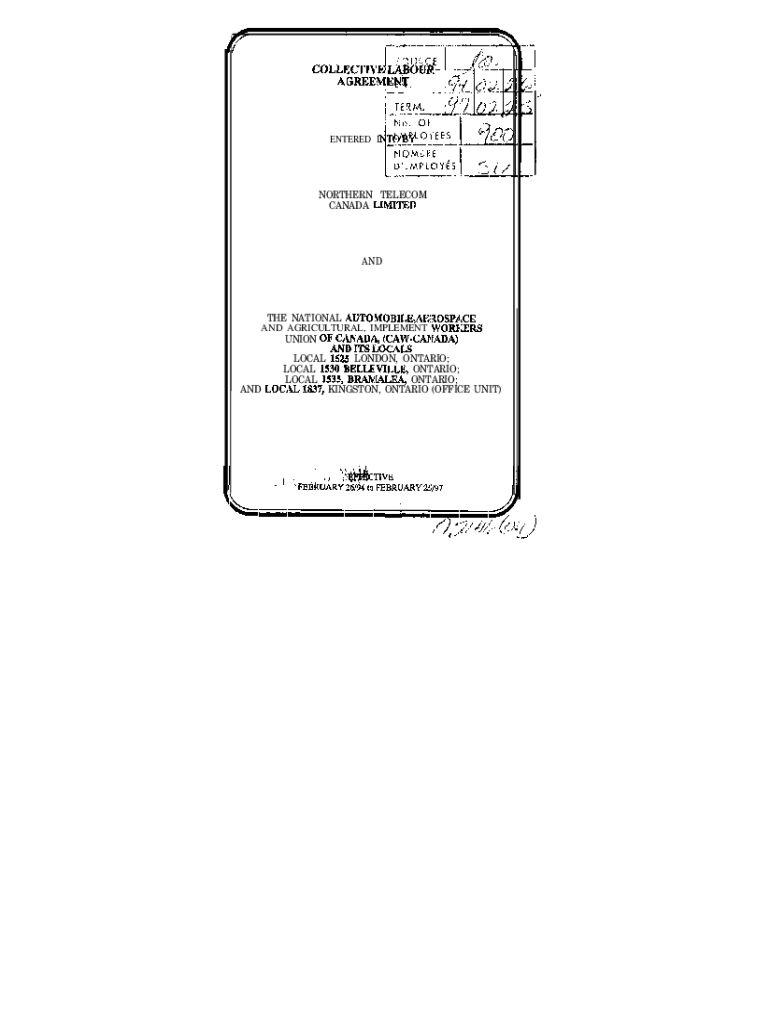 ENTERED NORTHERN TELECOM CANADA ILIMITEDANDTHE NATIONAL Automobile, AEIROSl?4CE AND AGRICULTURAL, IMPLEMENT WORK;ERS UNION OFWDADACANADA) LOCAL 1525 LONDON, ONTARIO; LOCAL 1530 BELLEVILLE, ONTARIO;