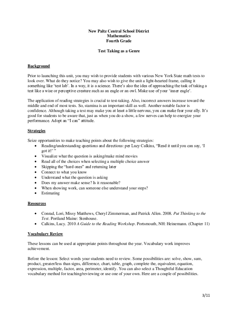 New Waltz Central School District Mathematics Fourth Grade Test Taking as a GenreBackground Prior to launching this unit, you may wish to provide students with various New York State math tests to