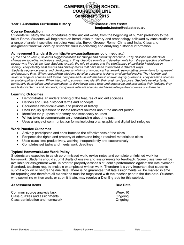 CAMPBELL HIGH SCHOOL COURSE OUTLINE Semester 1 2015 Year 7 Australian Curriculum HistoryTeacher: Ben Foster benjamin.foster@ed.act.edu.auCourse Description Students will study the major features of