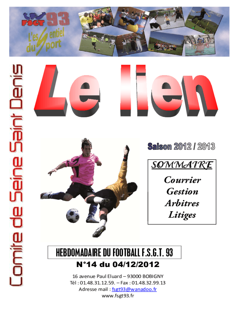 SUMMARY Courier Section Arbiters LitigesHEBDOMADAIRE DU FOOTBALL F.S.G.T. 93 N14 Du 04/12/2012 16 avenue Paul Eduard 93000 BOMBING Tl : 01.48.31.12.59. Fax : 01.48.32.99.13 Address mail : fsgt93@wanadoo.fr