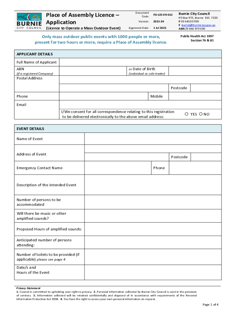 Place of Assembly License Application(License to Operate a Mass Outdoor Event)Document Code: Version: Approved Date:FOLESEH013 202324 1 Jul 2023Only mass outdoor public events with 1000 people or