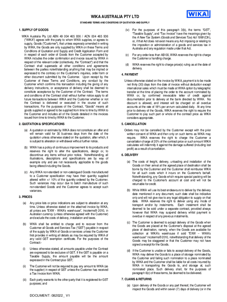 WIKI AUSTRALIA PTY LTD STANDARD TERMS AND CONDITIONS OF QUOTATION AND SUPPLY1. SUPPLY OF GOODS WIKI Australia Pty Ltd ABN 49 004 465 936 / ACN 004 465 936 (\”WIKI\”) agrees with the party to whom