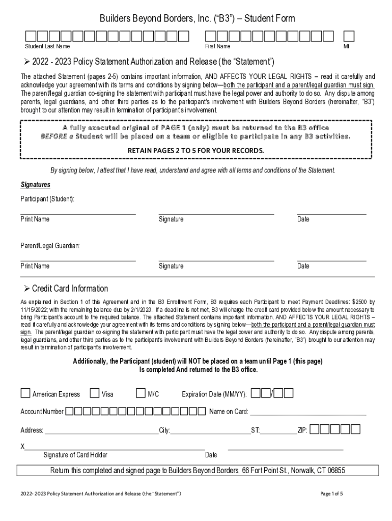Builders Beyond Borders, Inc. (B3) Student Form Student Last NameFirst Name MI 2022 2023 Policy Statement Authorization and Release (the Statement) The attached Statement (pages 25) contains important