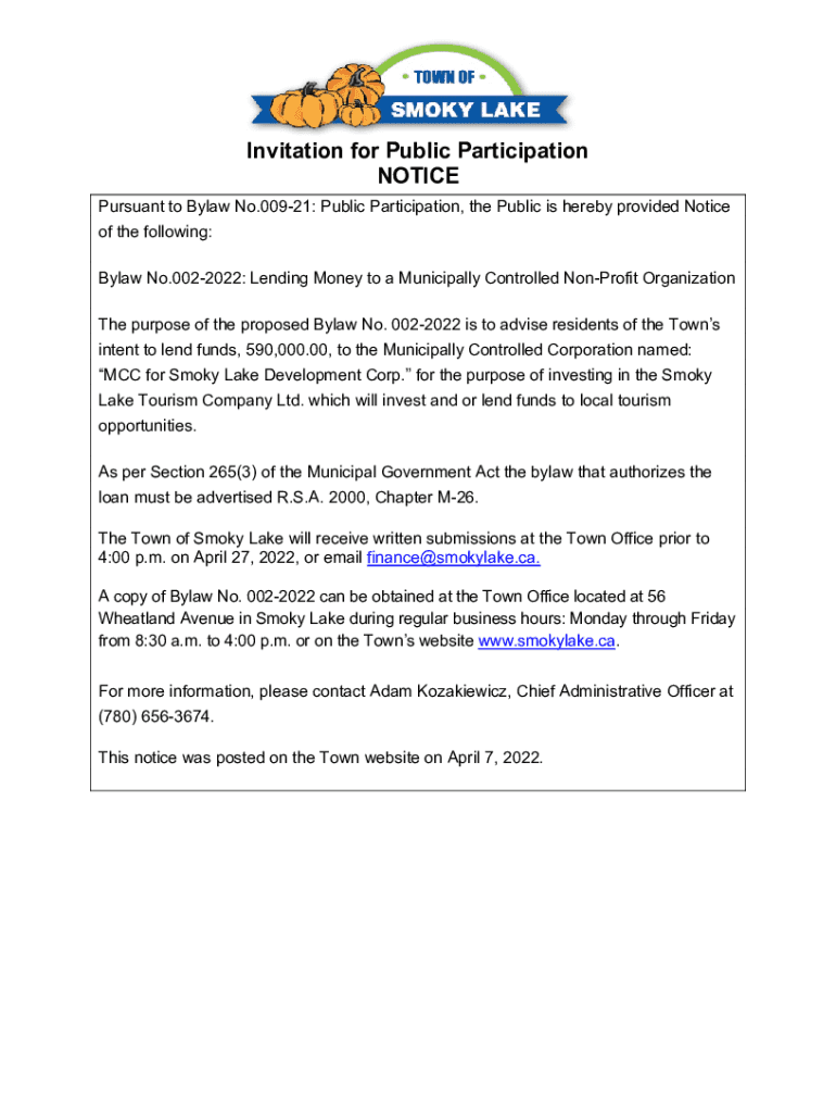 Invitation for Public Participation NOTICE Pursuant to Bylaw No.00921: Public Participation, the Public is hereby provided Notice of the following: Bylaw No.0022022: Lending Money to a Municipally