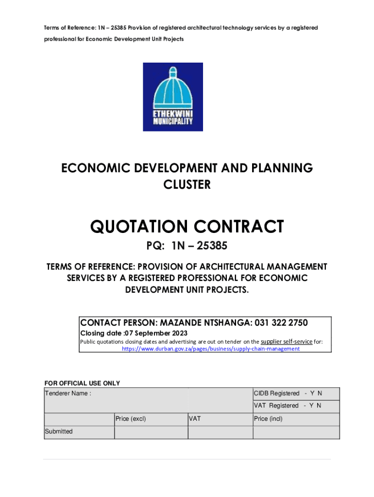 Terms of Reference: 1 N 25385 Provision of registered architectural technology services by a registered professional for Economic Development Unit ProjectsECONOMIC DEVELOPMENT AND PLANNING CLUSTERQUOTATION