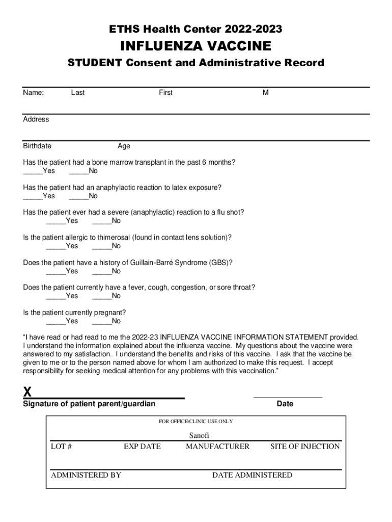 ETAS Health Center 20222023INFLUENZA VACCINE STUDENT Consent and Administrative Record Name:LastFirstMAddressBirthdateAgeHas the patient had a bone marrow transplant in the past 6 months? ___Yes ___No