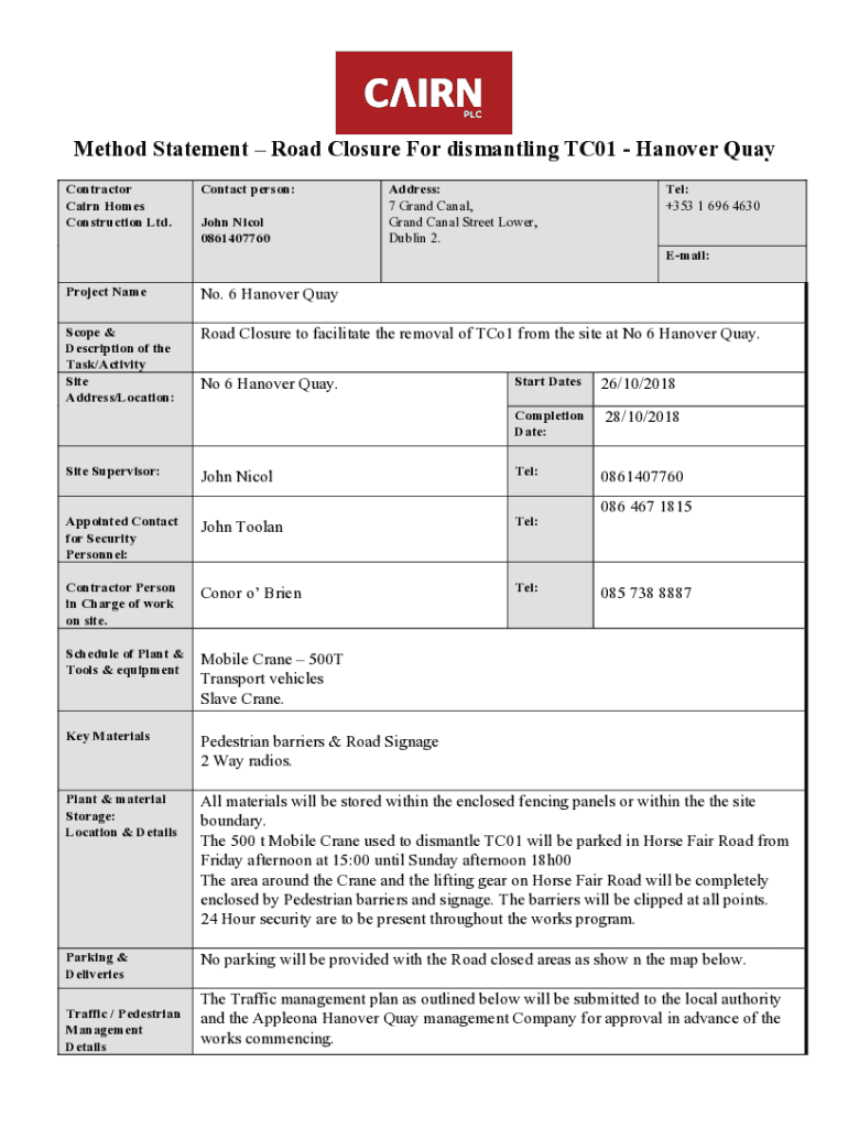 Method Statement Road Closure For dismantling TC01 Hanover Subcontractor Cairn Homes Construction Ltd. Contact person: John Nicole 0861407760Address: 7 Grand Canal, Grand Canal Street Lower, Dublin