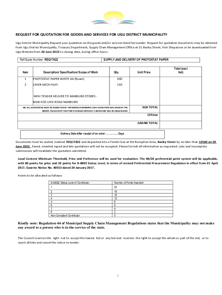 REQUEST FOR QUOTATION FOR GOODS AND SERVICES FOR UGU DISTRICT MUNICIPALITY UGU District Municipality Request your quotation on the goods and/or services listed hereunder. Request for quotation documents