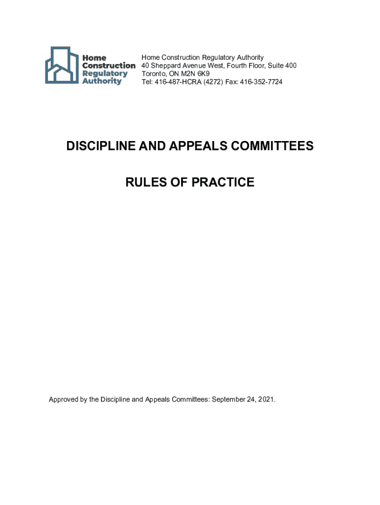 Home Construction Regulatory Authority 40 Sheppard Avenue West, Fourth Floor, Suite 400 Toronto, ON M2N 6K9 Tel: 416487HCRA (4272) Fax: 4163527724DISCIPLINE AND APPEALS COMMITTEES RULES OF PRACTICEApproved