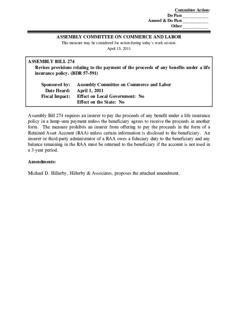 Committee Action: Do Pass ___ Amend & Do Pass ___ Other ___ASSEMBLY COMMITTEE ON COMMERCE AND LABOR This measure may be considered for action during today's work session. April 15, 2011ASSEMBLY BILL