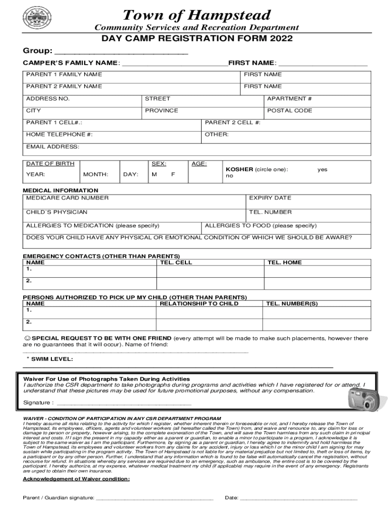 Town of Hempstead Community Services and Recreation Department DAY CAMP REGISTRATION FORM 2022 Group: ___ CAMPERS FAMILY NAME: ___FIRST NAME: ___ PARENT 1 FAMILY NAMEFIRST APPARENT 2 FAMILY NAMEFIRST