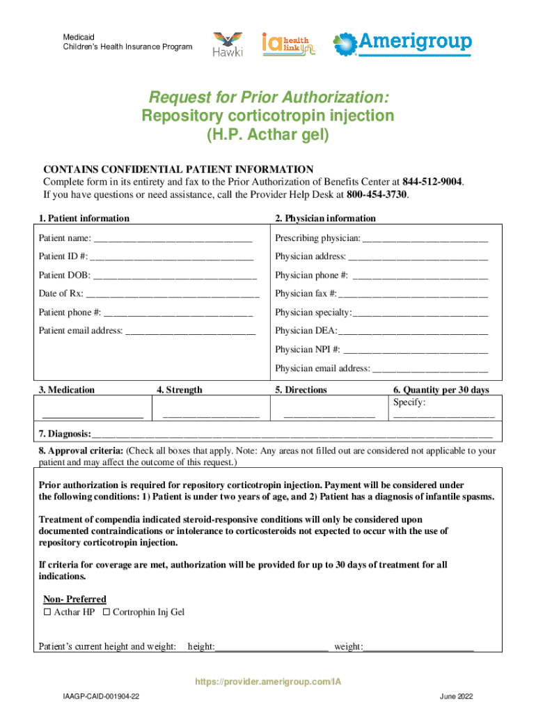 Medicaid Children's Health Insurance ProgramRequest for Prior Authorization: Repository injection () CONTAINS CONFIDENTIAL PATIENT INFORMATION Complete form in its entirety and fax to the Prior Authorization