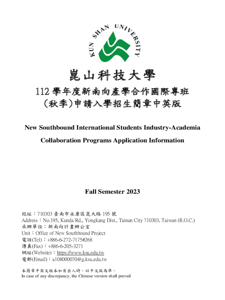 112 () New Southbound International Students IndustryAcademia Collaboration Programs Application Informational Semester 2023710303 195 Address No.195, Kinda Rd., Pyongyang Dist., Tainan City 710303,