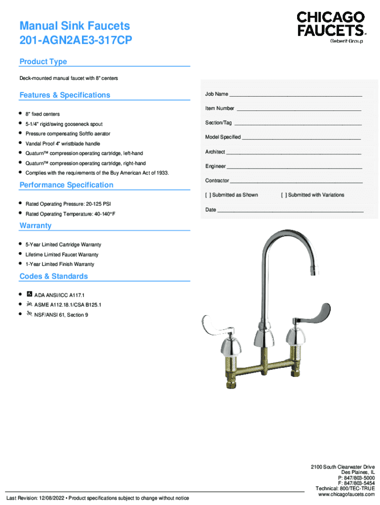 Deck mounted manual faucet with 8\” centersFeatures & Specifications Job Name ___