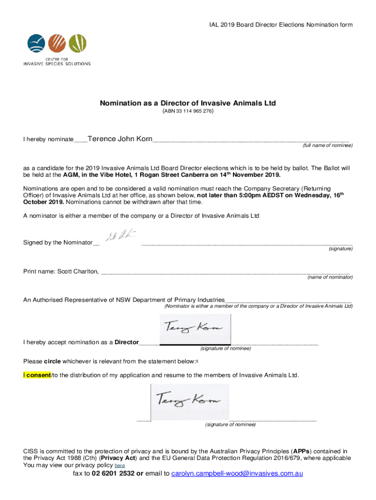 ILL 2019 Board Director Elections Nomination renomination as a Director of Invasive Animals Ltd (ABN 33 114 965 276)I hereby nominate___TerenceJohn Born___ (full name of nominee)as a candidate for
