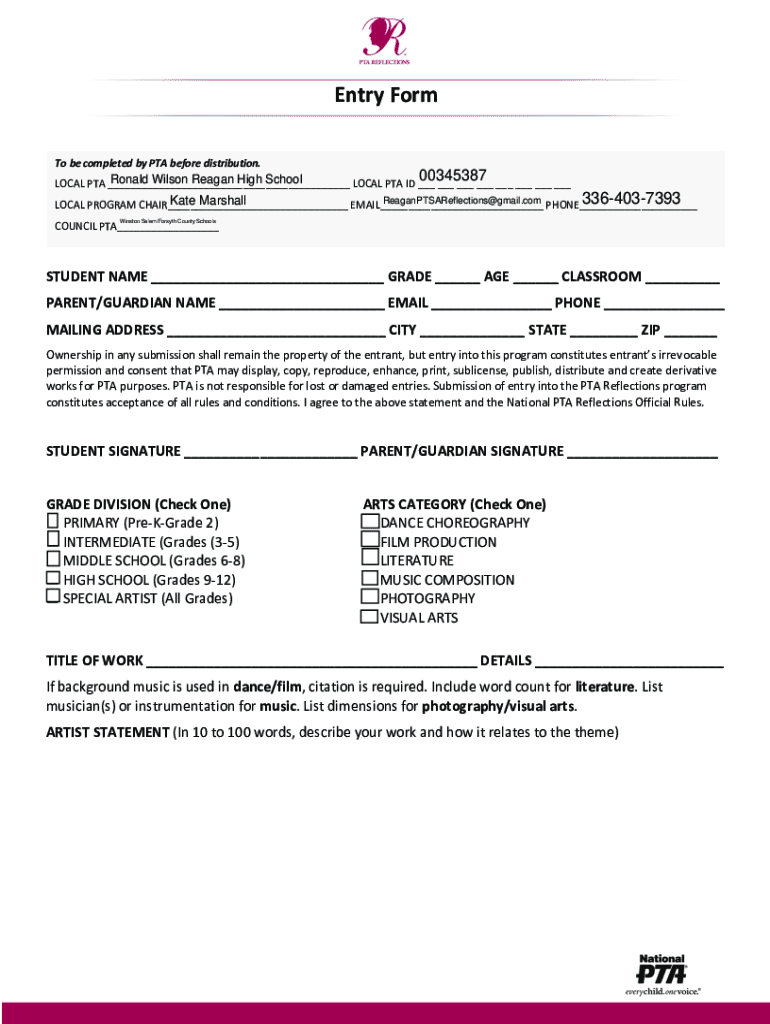 Entry Form To be completed by PTA before distribution.00345387Ronald Wilson Reagan High School LOCAL PTA ___ LOCAL PTA ID ___ ___ ___ ___ ___ ___ ___ ___3364037393 ReaganPTSAReflections@gmail.com