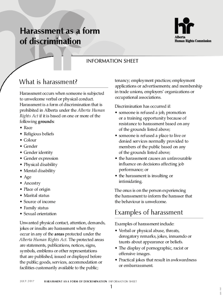 Harassment as a form ofdiscriminationWhat is harassment?tenancy; employment practices; employment applications or advertisements; and membership in trade unions, employers organizations or occupational