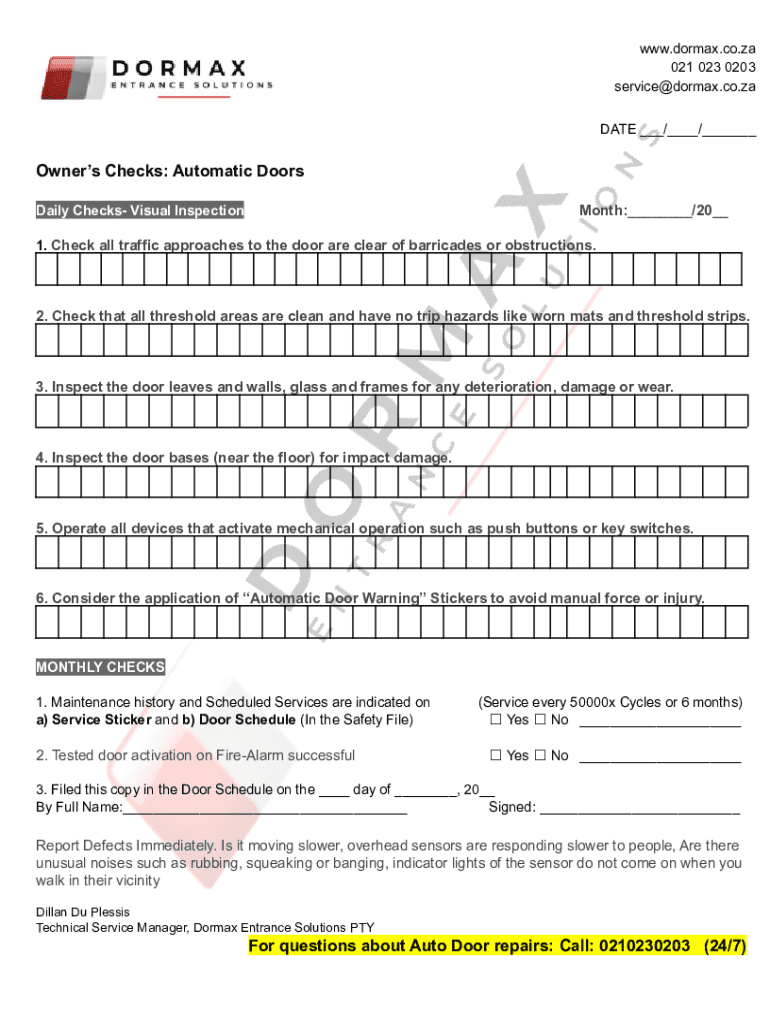WWW.dorm ax.co.ZA 021 023 0203 service@dormax.co.za DATE ___/___/___Owners Checks: Automatic Doors Month:___/20__Daily Checks Visual Inspection1. Check all traffic approaches to the door are clear