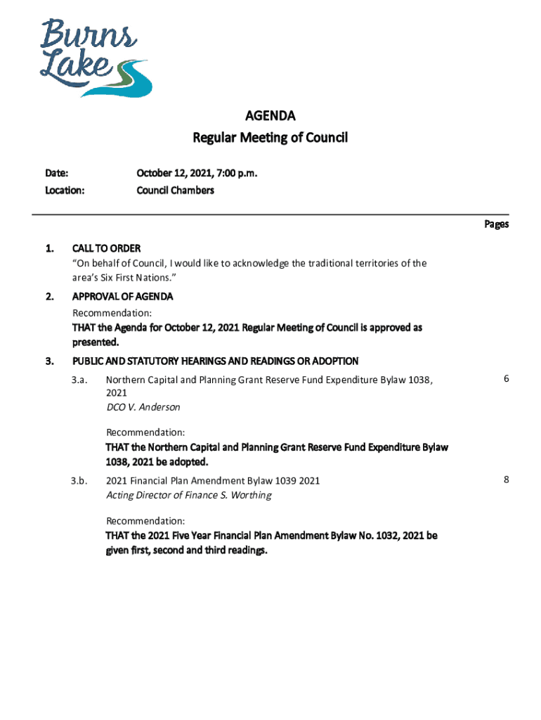 AGENDA Regular Meeting of Council Date:October 12, 2021, 7:00 p.m. Location:Council Chambers Pages1.CALL TO ORDER On behalf of Council, I would like to acknowledge the traditional territories of the