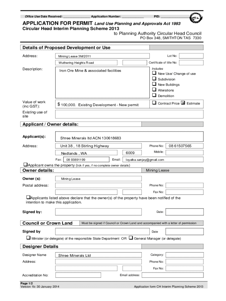 Office Use Date Received: ___ Application Number: ___PID: ___APPLICATION FOR PERMIT Land Use Planning and Approvals Act 1993 Circular Head Interim Planning Scheme 2013 to Planning Authority Circular