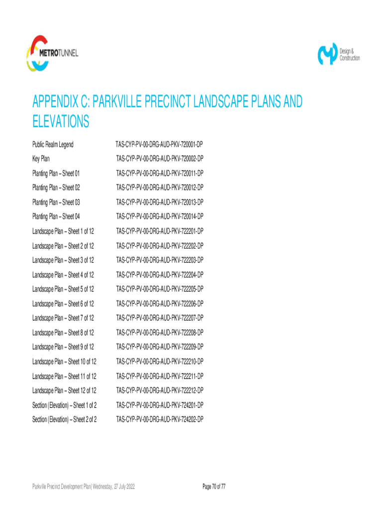APPENDIX C: PARKVILLE PRECINCT LANDSCAPE PLANS AND ELEVATIONS Public Realm LegendTASCYPPV00DRGAUDPKV720001DPKey PlanTASCYPPV00DRGAUDPKV720002DPPlanting Plan Sheet 01TASCYPPV00DRGAUDPKV720011DPPlanting