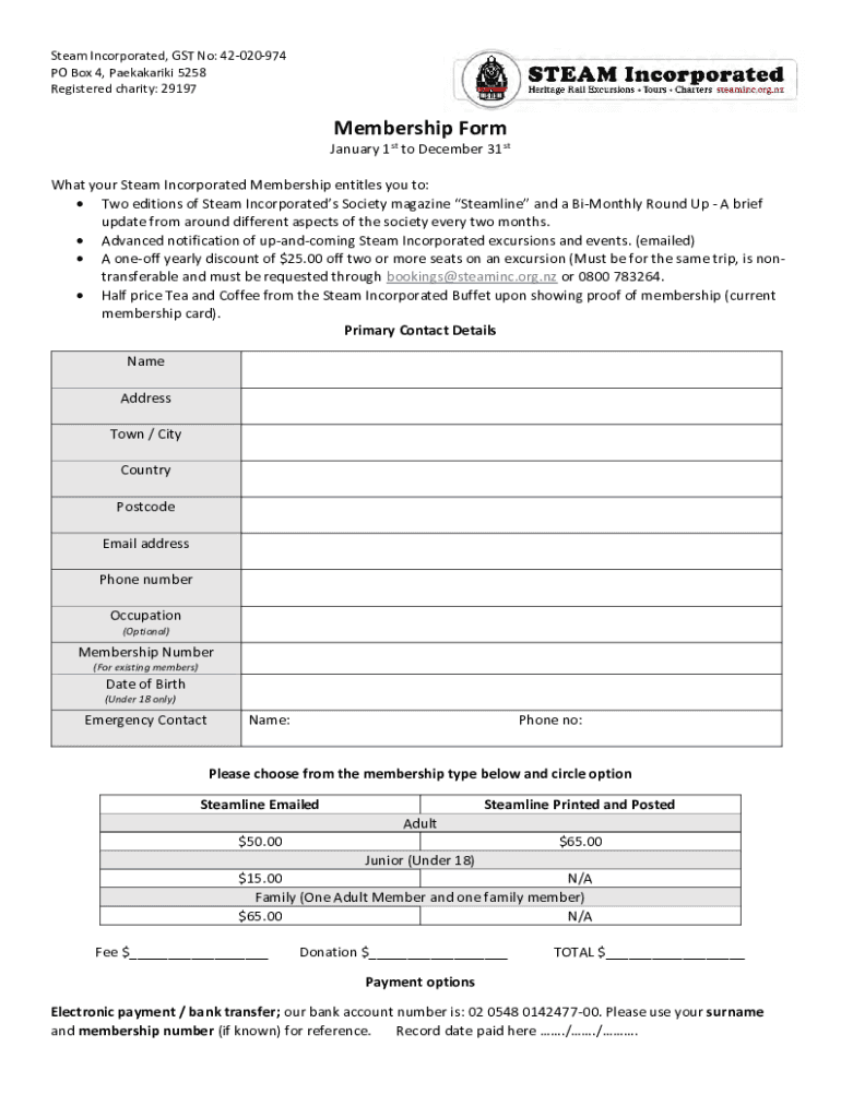 Steam Incorporated, GST No: 42020974 PO Box 4, Paekakariki 5258 Registered charity: 29197Membership Form January 1st to December 31st What your Steam Incorporated Membership entitles you to: Two editions