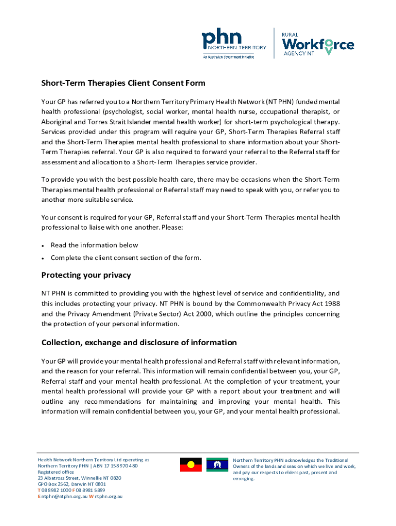 Shorter Therapies Client Consent Form Your GP has referred you to a Northern Territory Primary Health Network (NT PhD) funded mental health professional (psychologist, social worker, mental health