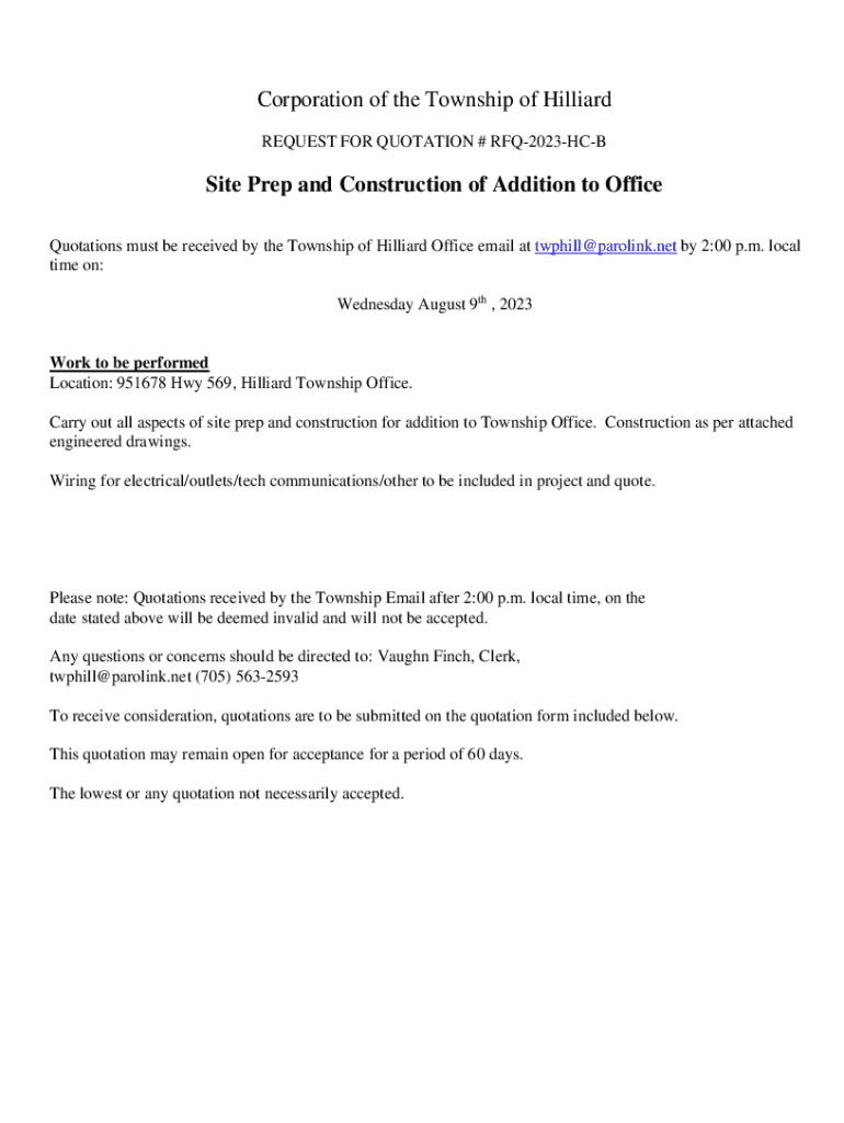Corporation of the Township of Billiard REQUEST FOR QUOTATION # RFQ2023HCBSite Prep and Construction of Addition to Office Quotations must be received by the Township of Billiard Office email at twphill@parolink.net
