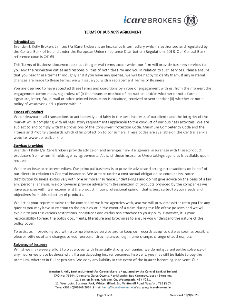 TERMS OF BUSINESS AGREEMENT Introduction Brendan J. Kelly Brokers Limited t/a icier broker is an Insurance Intermediary which is authorized and regulated by the Central Bank of Ireland under the European