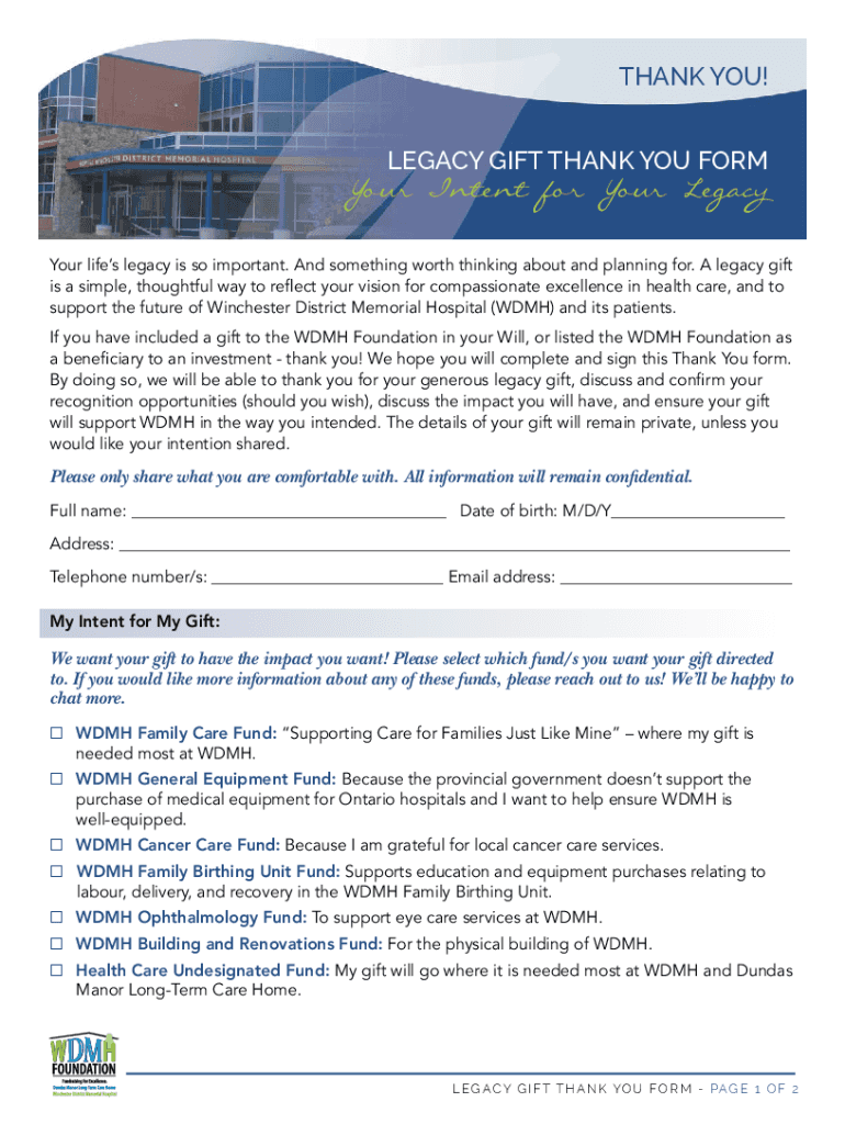 THANK YOU! LEGACY GIFT THANK YOU Former Intent for Your Legacy Your lives legacy is so important. And something worth thinking about and planning for. A legacy gift is a simple, thoughtful way to