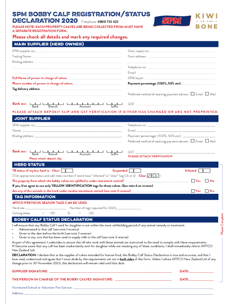 SPM BOBBY CALF REGISTRATION/STATUS DECLARATION 2020 Freephone: 0800 722 422 PLEASE NOTE: EACH PROPERTY CALVES ARE BEING COLLECTED FROM MUST-HAVE A SEPARATE REGISTRATION FORM. Please check all details