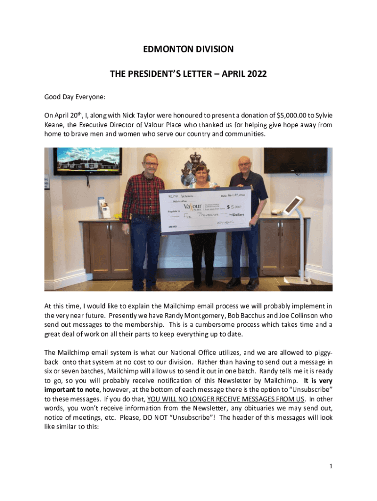 EDMONTON DIVISION THE PRESIDENTS LETTER APRIL 2022 Good Day Everyone: On April 20th, I, along with Nick Taylor were honored to present a donation of $5,000.00 to Sylvie Keane, the Executive Director