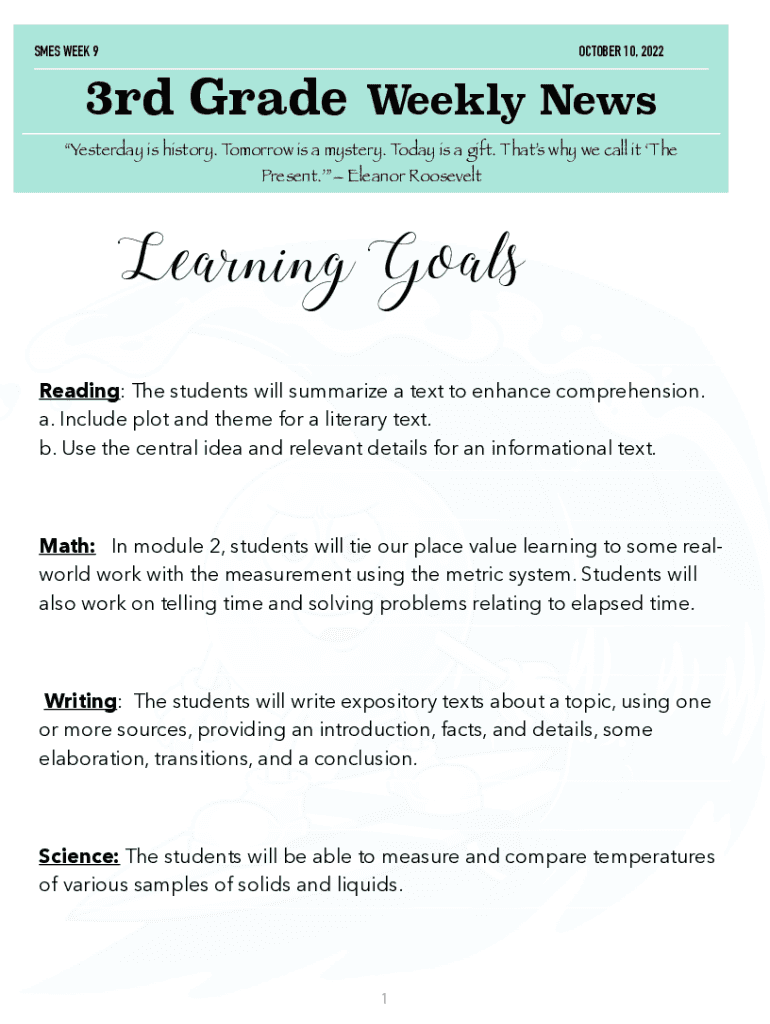 SMEs WEEK 9OCTOBER 10, 20223rd Grade Weekly News