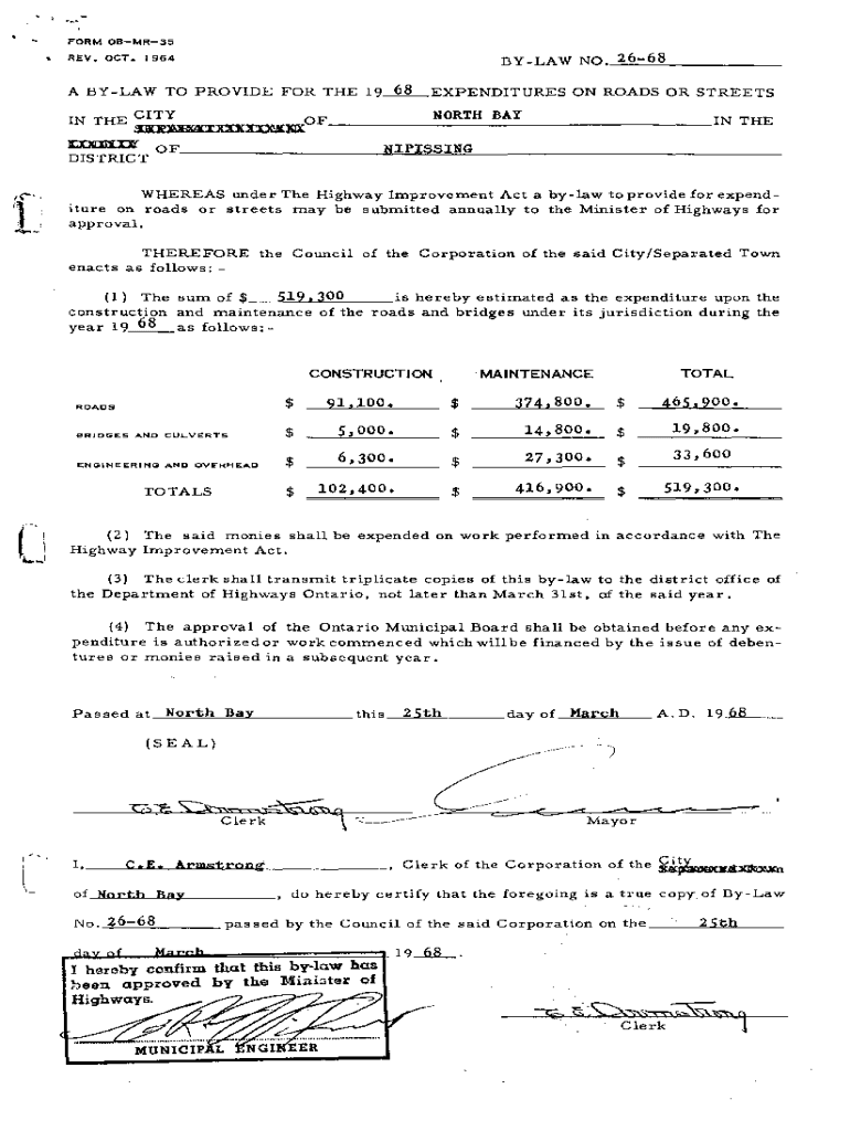 FORM 08MR35ByLAw NO. . .:2;:. :.6__:::6_;:8;.___REV. OCT. I 96468A BYLAW TO PROVIDE FOR THE 19EXPENDITURES ON ROADS OR STREET SIN THE CITY OF_ _ _ _ _ _N_O_R_T_H_B_A_Y_ _ _ _ _ _ _ _ _ _ IN THE UJPDOCXXXXXD.