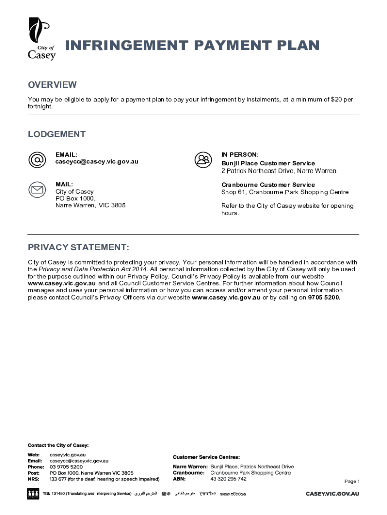 INFRINGEMENT PAYMENT PLAN OVERVIEW You may be eligible to apply for a payment plan to pay your infringement by installments, at a minimum of $20 per fortnight. JUDGEMENT EMAIL: caseycc@casey.vic.gov.auIN
