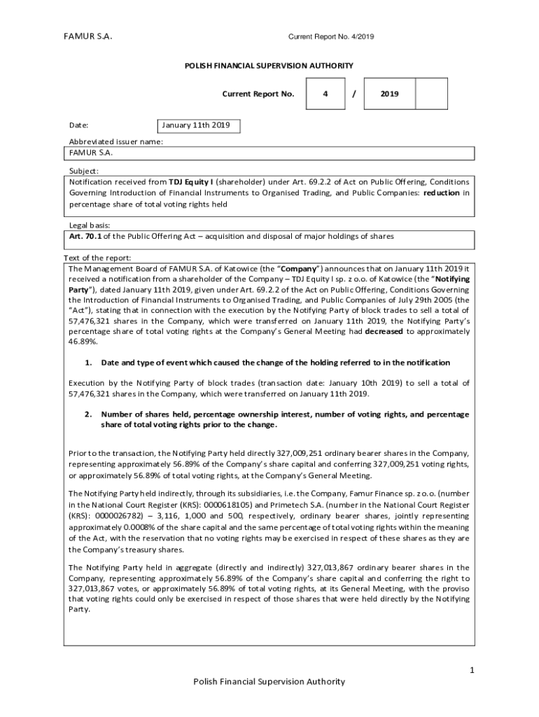 FEMUR S.A. Current Report No. 4/2019POLISH FINANCIAL SUPERVISION AUTHORITY Current Report No. Date:4/2019January 11th 2019Abbreviated issuer name: FEMUR S.A. Subject: Notification received from TDI